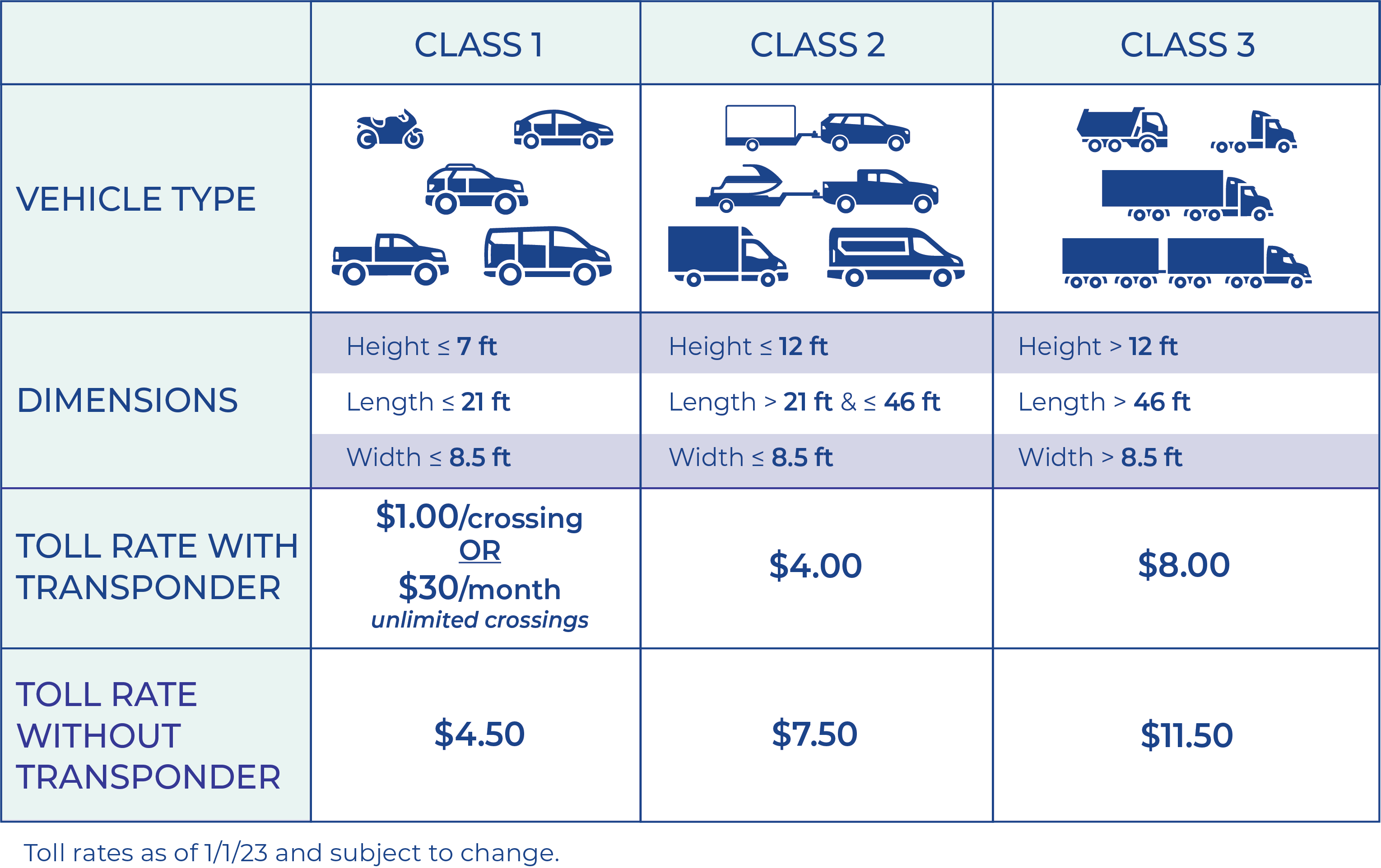 Drivers also have the option of paying a $40 flat monthly fee for unlimited Class 1 vehicle crossings with transponder.